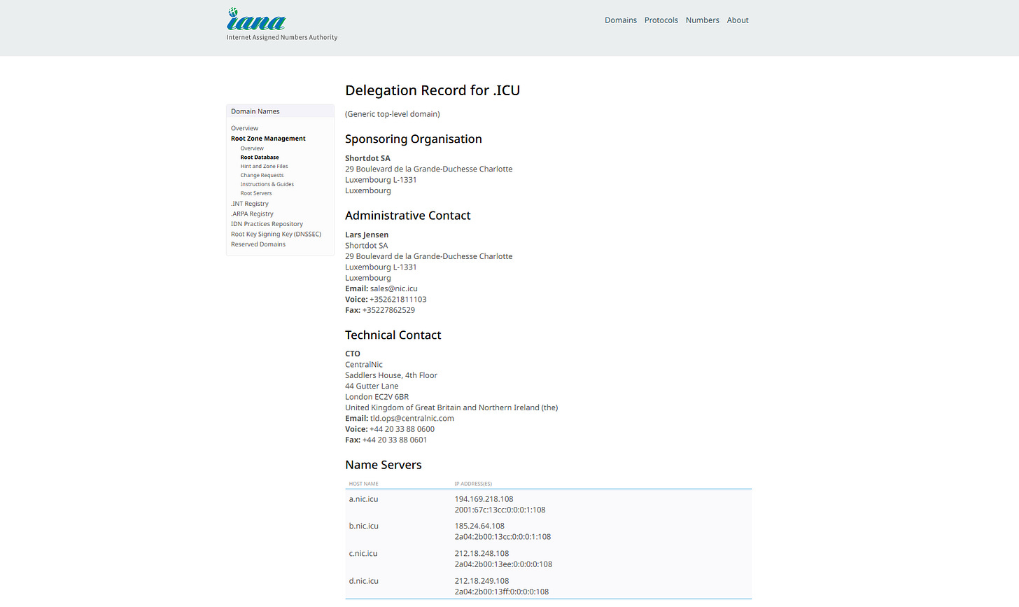 According to IANA — the Internet Assigned Numbers Authority, which maintains the global DNS root — the .icu top-level domain is delegated through four nameservers: a.nic.icu, b.nic.icu, c.nic.icu, and d.nic.icu, which should resolve to specific IP addresses operated by CentralNic on behalf of the registry.