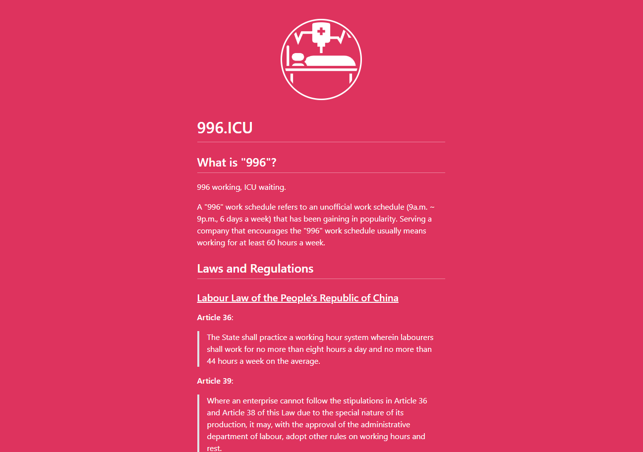 The 996.ICU project was initiated by an anonymous user on GitHub on 26 March 2019. The person complained that the “996” work schedule — 9am to 9pm, six days a week — recently advocated by some prominent entrepreneurs in the Chinese tech industry risked sending employees straight to the intensive care unit. The name of the domain was the protest itself.