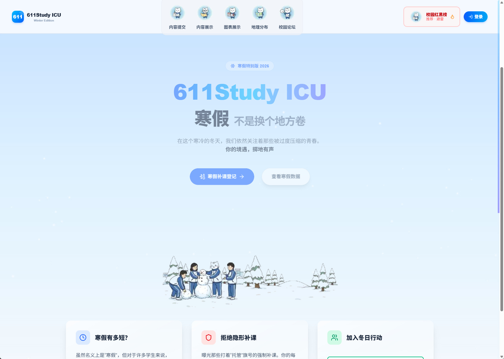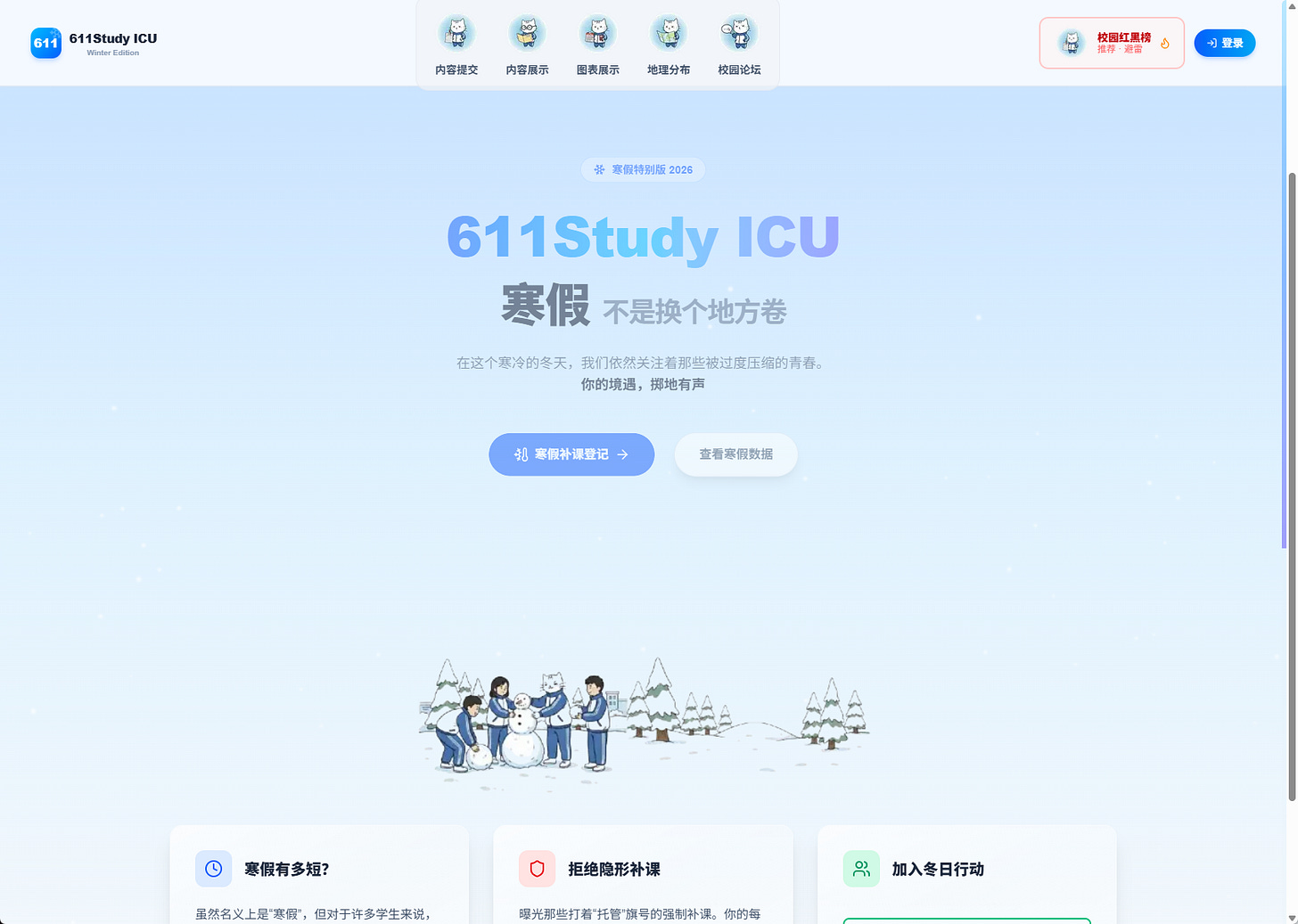 The .icu extension became a template. 611Study.ICU — standing for “study from 6 AM to 11 PM, and end up in ICU” — was launched as a crowdsourced documentation project targeting the enforced schedules of Chinese high school students, with countless students suffering both physically and mentally from the schedule. The project’s revelations that over 2,000 schools had illegally forced students back early for extended study hours triggered public outrage, prompting authorities in at least one Chinese city to issue directives banning early returns.